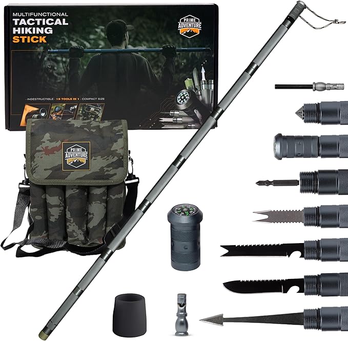 15-in-1 Tactical Survival Walking Stick & Hiking Staff – Heavy-Duty Collapsible Multitool for Camping, Hiking & Outdoor Survival Gear